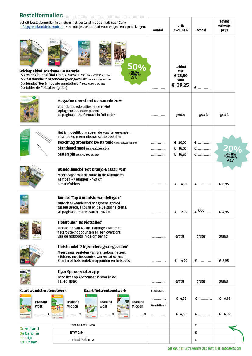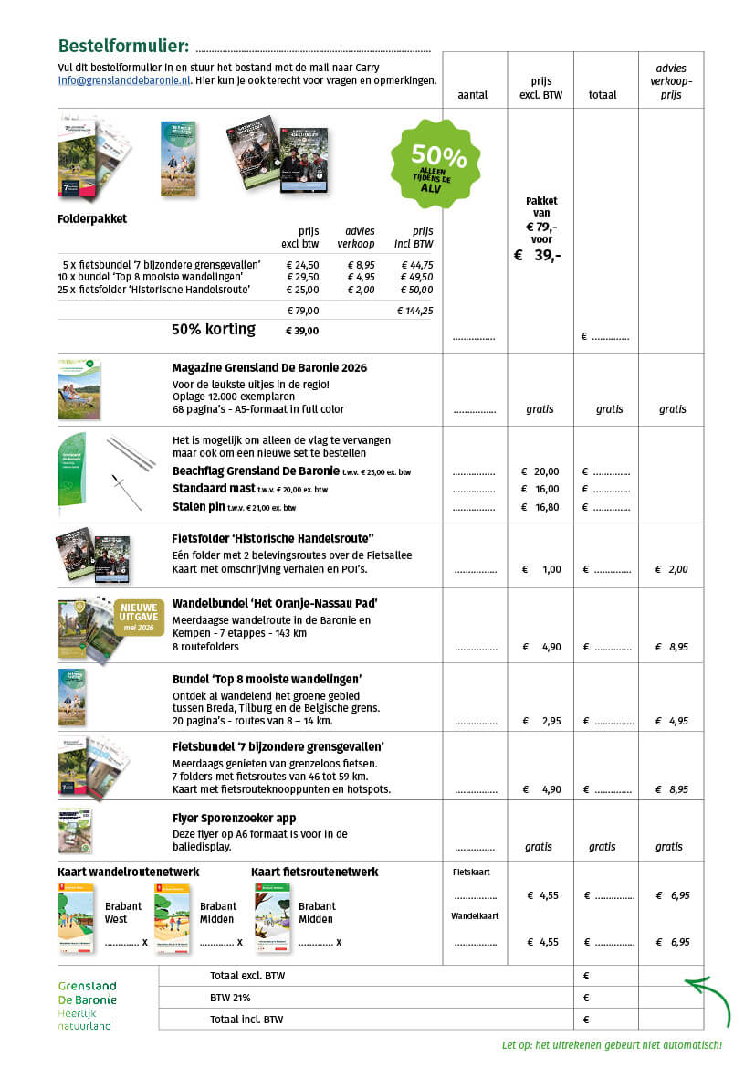 Download het bestelformulier, vul deze in en stuur het met de mail naar Carry [email protected]. Hier kun je ook terecht voor vragen en opmerkingen.