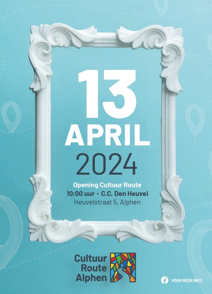 Om 10:00 uur is de opening van de route in het Cultureel Centrum Den Heuvel in Alphen. Hier is een kleine expositie van het werk van de deelnemers te zien met meer informatie over de disciplines en kunstenaars. Na de opening kan op eigen initiatief van 11.00 – 16.30 uur de route verkend worden. Aan jouw de keuze waar je een kijkje wilt nemen. Houd de Facebook pagina in de gaten voor de plattegrond en de deelnemers van de expositie.