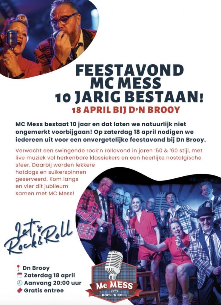 MC Mess bestaat 10 jaar en dat vieren we met een feestavond vol energie en nostalgie. Op zaterdag 18 april staan de deuren van D’n Brooy open voor een onvergetelijke rock-’n-rollavond in de sfeer van de jaren ’50 en ’60. Met live muziek, bekende klassiekers en een warme, feestelijke ambiance wordt het een avond voor jong en oud. Vanaf 20.00 uur ben je welkom en de toegang is gratis. Vier dit jubileum mee en laat je meevoeren door de muziek van MC Mess.