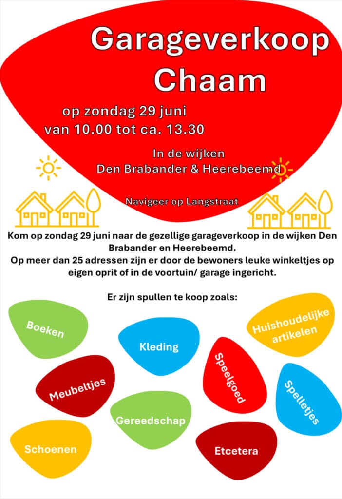 Buurtvereniging Den Brabander/Heerebeemd in Chaam houdt een Garageverkoop op zondag 29 juni 2025 van 10.00 tot ca 14.00 uur. Vanuit garages en inritten bieden diverse verkopers hun tweedehands spullen te koop aan. Er is voor ieder wat wils, zoals speelgoed, (kinder-)kleding, boeken, hobbyspullen, keukenspullen, woondecoratie, gereedschap etc. De garagesale vindt plaats in de wijk Den Brabander (dit is een wijk achter het oude gemeentehuis van Chaam. Navigeer: Langstraat Chaam).