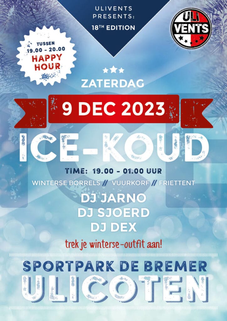 Trek je winterse outfit aan op zaterdag 9 december voor ICE-KOUD. Neem je vrienden mee voor dit coole feest onder leiding van DJ Jarno, met gastoptredens van DJ Sjoerd en DJ Dex. Nieuw dit jaar! Happy Hour van 19:00-20:00 uur. Het belooft een gezellige avond te worden, dus zorg dat je het niet mist!