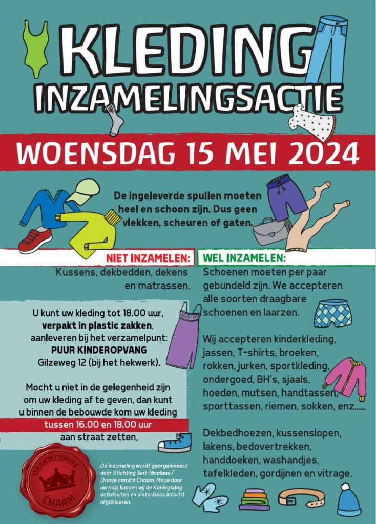 U kunt uw kleding tot 18:00 uur, verpakt in plastic zakken, aanleveren bij het verzamelpunt: