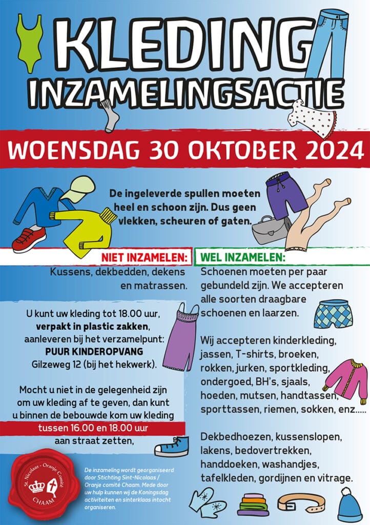 Op woensdag 30 oktober organiseert Stichting Sint Nicolaas-/ Oranje comité Chaam een kleding inzamelingsactie. De opbrengst komt volledig ten goede aan de Koningsdagactiviteiten en de Sinterklaasintocht in Chaam. Hoe meer kilogrammen door jullie worden aangeboden, hoe groter de indirecte financiële bijdrage is en hoe grootser er uitgepakt kan worden met extra leuke activiteiten voor de Chaamse kinderen. Hartelijk dank voor jullie medewerking!