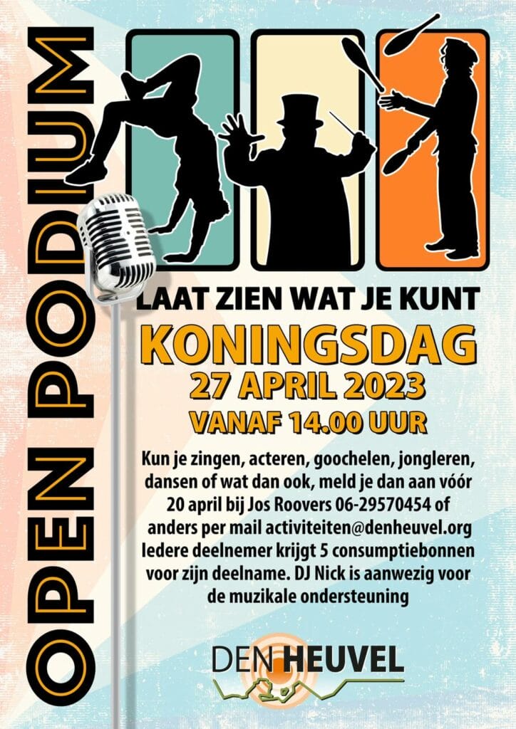 ’s Middags starten we om 14.00 uur binnen bij Den Heuvel met het Open Podium. Iedereen is welkom! Heb je zangtalent, acteertalent, kun je jongleren, toveren of noem maar op, dan kun je je aanmelden vóór 20 april. We gaan samen kijken, luisteren en genieten wat voor talenten er zijn in en rondom Alphen. Vanaf ongeveer 18.00 uur begint de feestavond en komt de live band Van Brenghe optreden! Zij spelen de mooiste rockcovers en de sfeer zal er gelijk in zitten. De feestavond eindigt rond 22.00 uur. De entree is gratis en iedereen is welkom!