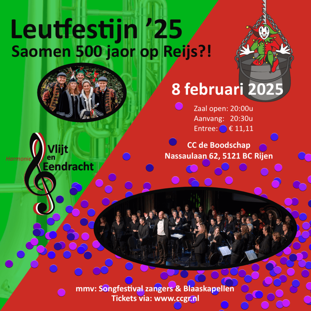Een unieke samenwerking tussen Harmonie Vlijt en Eendracht en de Rijense Carnaval Stichting in het kader van “500 jaor” Rijen. De handen zijn ineengeslagen om een spetterend en uniek carnavalsavond te verzorgen.