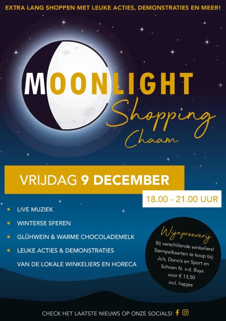 Kom vrijdag 9 december gezellig met een winters sfeertje shoppen in Chaam! Veel kaarsjes zullen dan binnen en buiten branden, er is glühwein en warme chocolademelk en gezellige live muziek. Natuurlijk zijn er ook leuke acties en demonstraties van de lokale winkeliers en horeca. Kom je ook gezellig shoppen en genieten?