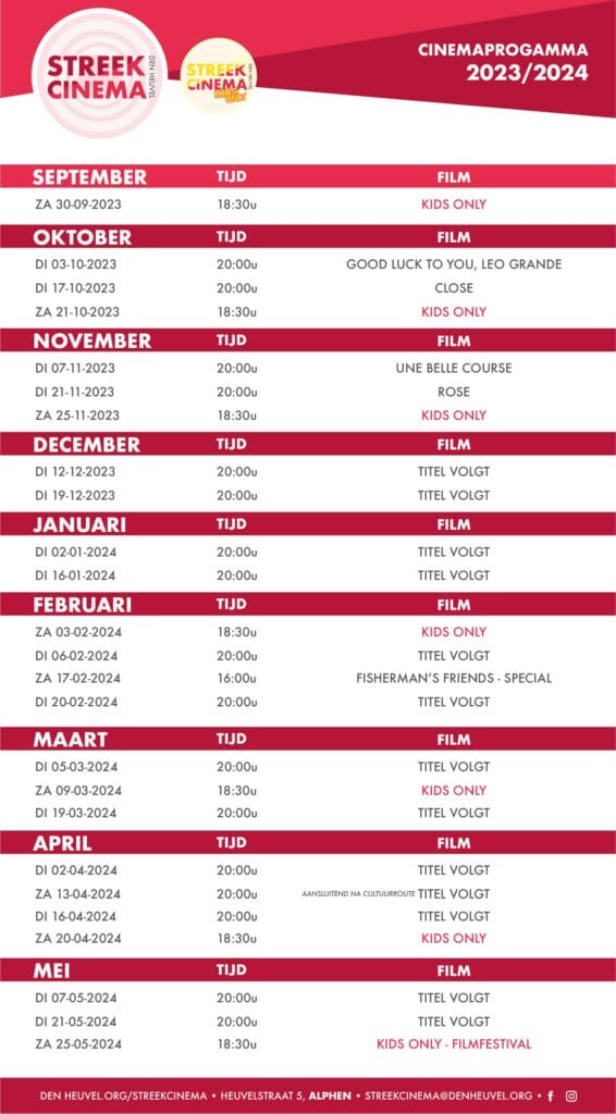 Klaar voor een nieuw cinemaseizoen? Een handig ezelsbruggetje: dinsdagavond=filmavond! Dit seizoen met een vaste aanvangstijd: 20:00 uur. Alle data zijn bekend, dus noteer ze alvast in je agenda! Vanaf dinsdag 3 oktober kun je komen genieten van de mooiste films bij Cultureel Centrum Den Heuvel in Alphen. Tip: neem een cinemapas mee als je van plan bent vaker te komen.