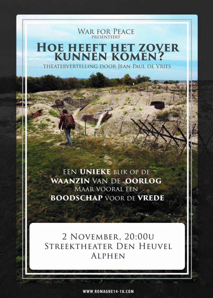 “Sinds twee jaar geef ik interactieve lezingen op scholen in Nederland. Veel vraag leidde tot deze theatervertelling, over de oorlog van toen, een situatie die helaas ook nu weer actueel is. De man onder de helm staat centraal, want aan welke kant je ook staat: een mens blijft een mens. Aan de hand van mijn ongewone levensloop neem ik je mee in hoe mijn aanvankelijke fascinatie verworden is tot een boodschap voor de vrede.”