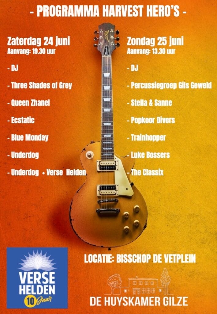 Verse Helden bestaat 10 jaar. Ze vieren dit op 24 en 25 juni met een gevarieerd live muziekprogramma op het Bisschop De Vetplein (De Huyskamer Gilze) met o.a. Popkoor Divers, Luuk Bossers en Percussiegroep Gils Geweld. Dit wordt een mega groot spektakel, dus ga dat zien en horen!