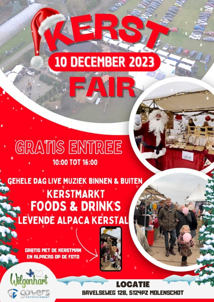 Zondag 10 december is het zover! Wilgenharts kerstfair. Meet de kerstman en geniet van heerlijke livemuziek zowel binnen als buiten, foods and drinks, kom kijken bij de levende alpaca kerststal en geniet van de december kerstsfeer op de kerstmarkt! De entree is gratis. TIP: ga op de foto met de kerstman en de alpaca’s.