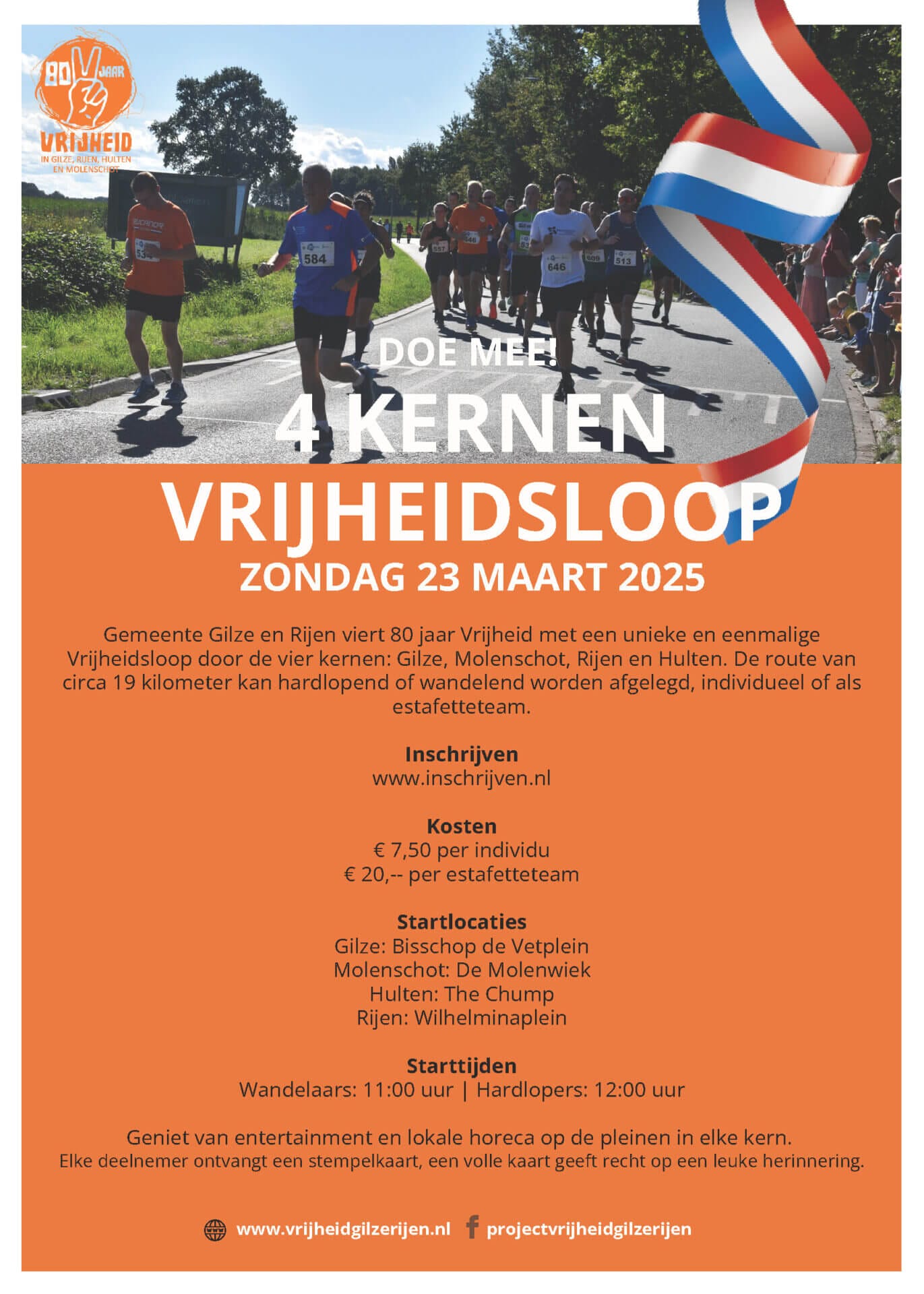Diverse locatiesDe 4-Kernen-Vrijheidsloop is een recreatieve loop van circa 20 kilometer, die al wandelend of hardlopend kan worden afgelegd. Met deze eenmalige vrijheidsloop verbinden we de vier kernen van onze gemeente met elkaar tot een prachtig parcours.