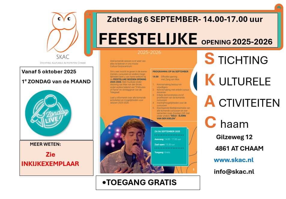 Gilzeweg 12 | ChaamNa vele uren voorbereiding is het dan eindelijk zover. De agenda van “het SKAC “, die vol zit met diverse muzikale optredens, leuke activiteiten en cursussen, zal gepresenteerd worden tijdens een feestelijke opening. Toegang is gratis.