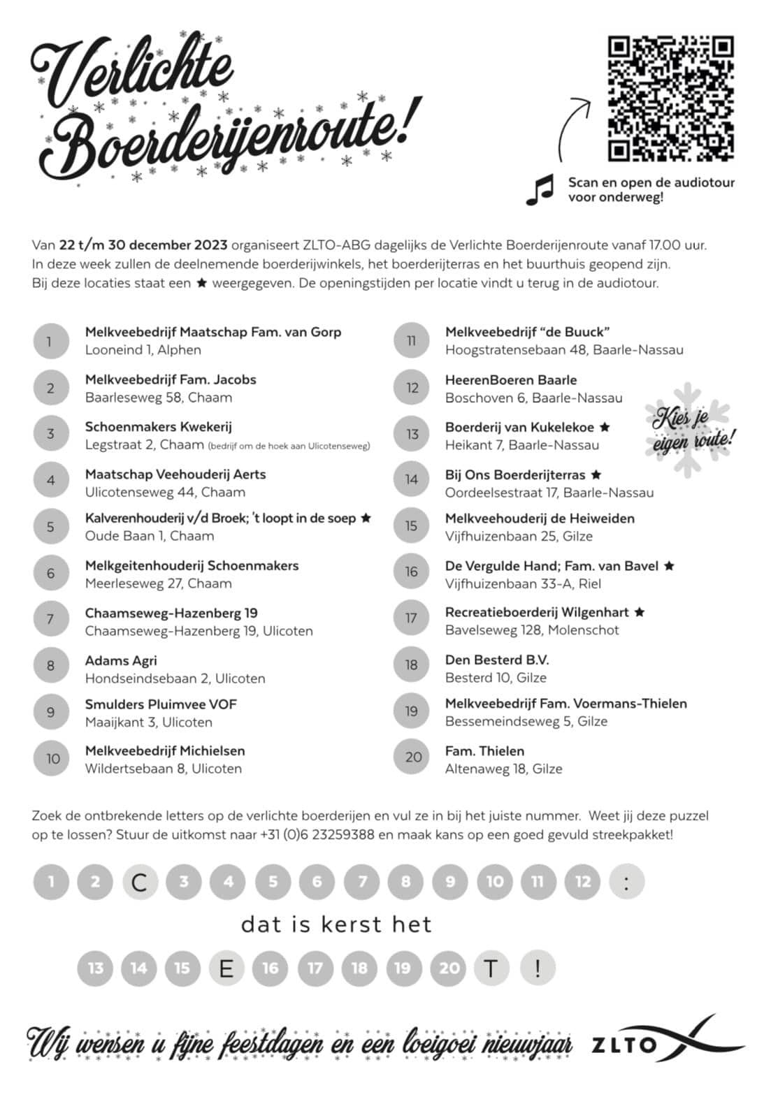 Melkveebedrijf Voermans Horst 12, Gilze, Noord-Brabant, NederlandVan 22 t/m 30 december is er een mooie verlichte boerderijenroute te zien, georganiseerd door ZLTO. Op vrijdag 22 december is de opening van deze route en is er iets extra's te doen. Veel plezier!