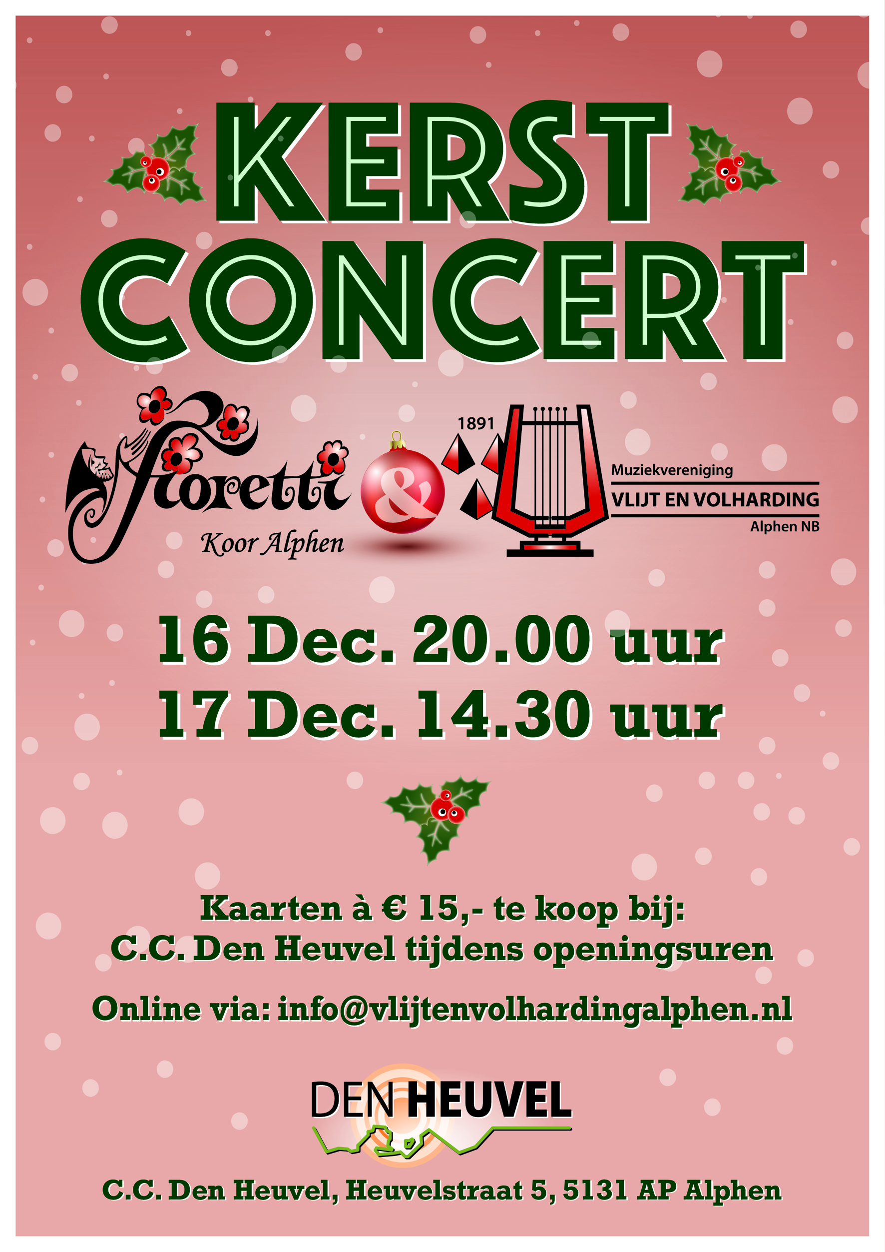 CC Den Heuvel, Heuvelstraat 5, AlphenKom in het weekend van 15, 16 en 17 december genieten van een speciaal kerstconcert in Den Heuvel in Alphen. Geniet van de prachtige muziek van het Fiorettikoor en Muziekvereniging Vlijt en Volharding uit Alphen.
