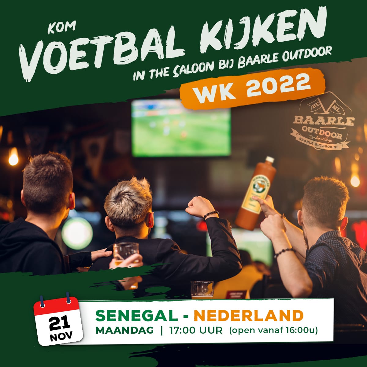 Baarle Outdoor Bredaseweg 5, Baarle-Nassau, Noord-Brabant, NederlandZijn jullie klaar om ons Nederlandse elftal te zien schitteren? Op 21 november is het zover, dan staat de eerste wedstrijd Senegal-Nederland op de planning. Kom je ook gezellig kijken en Nederland aanmoedigen bij Baarle Outdoor & Leisure?