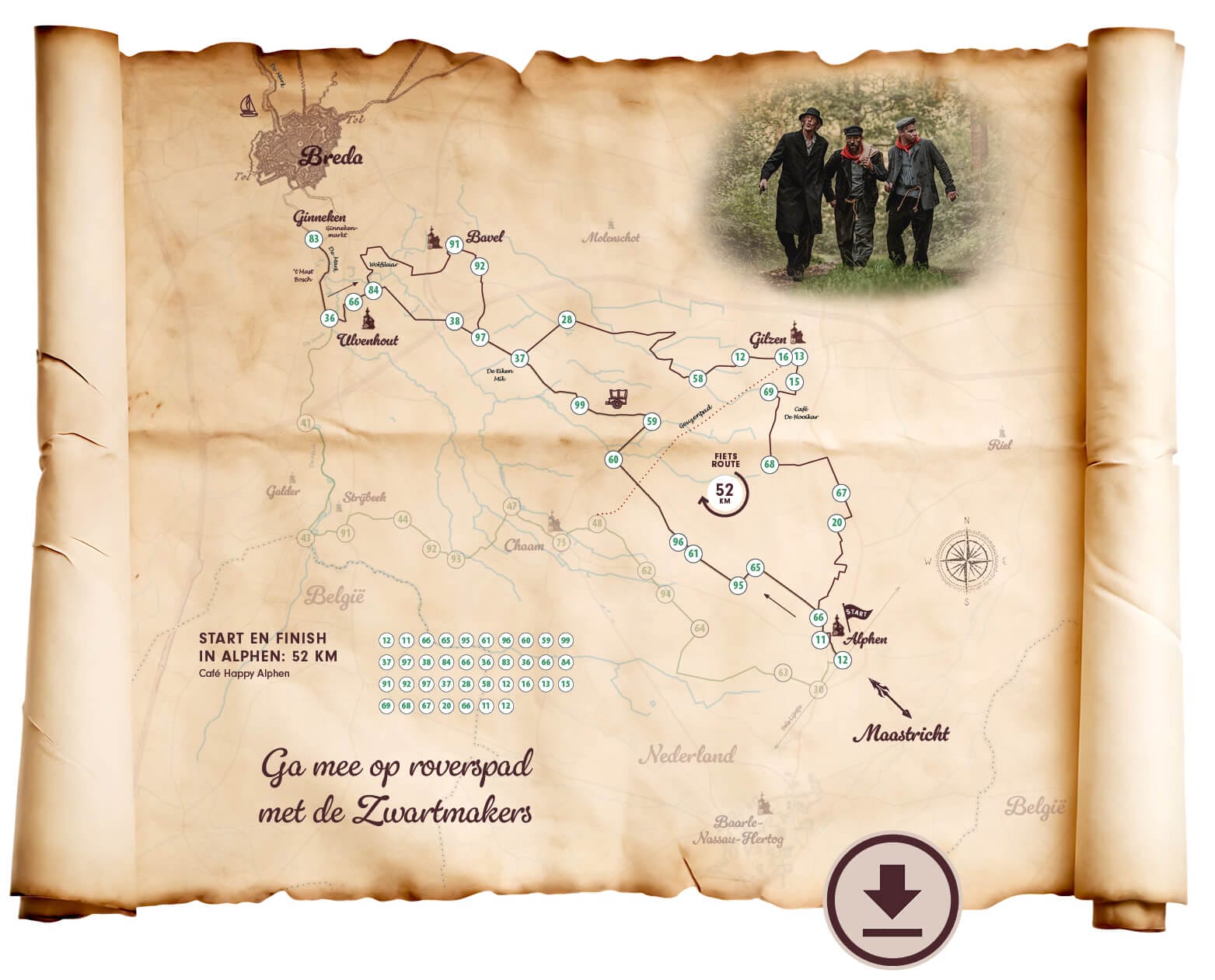 De tocht over de handelsroute tussen Breda en Maastricht was niet zonder gevaar. In de zestiende en zeventiende eeuw hadden handelsreizigers veel last van allerlei gespuis. Er waren soldaten die de koopwaar inpikten, zelfs wanneer de papieren netjes in orde waren. Dan had je de Bende van Alphen: beroemd en berucht in de wijde omtrek. En tot slot waren er nog de Zwartmakers, die roet, buskruit of het vet van een koekenpan op hun gezicht smeerden. Zo bleven ze onherkenbaar en jaagden ze hun slachtoffers de stuipen op het lijf.