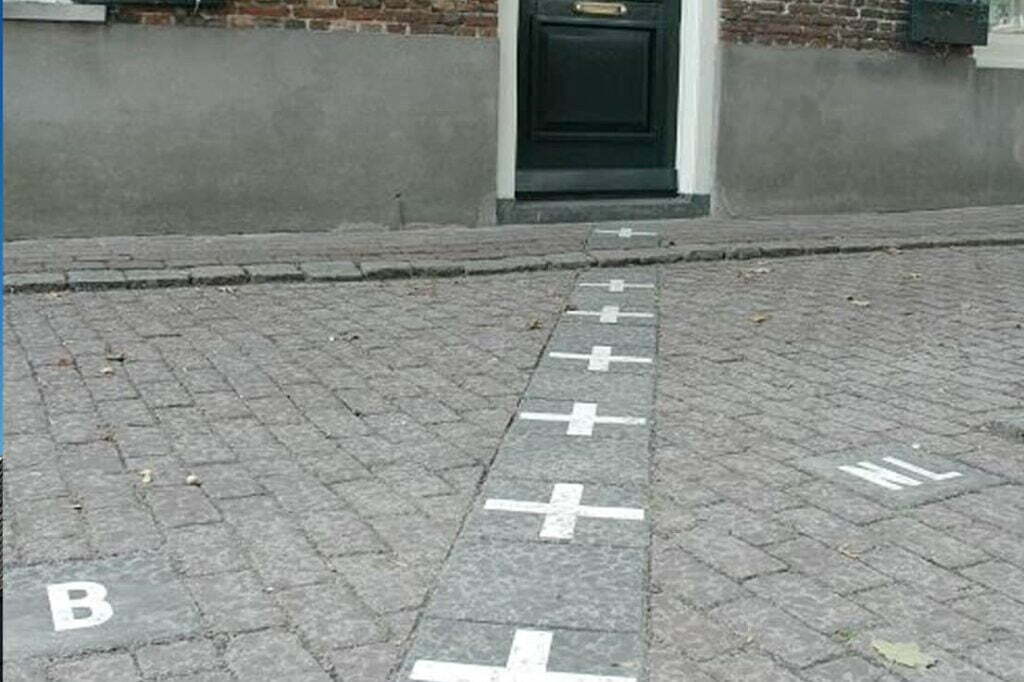 Met speciale stoeptegels en aluminium plaatjes in het wegdek worden de enclavegrenzen aangegeven toerismebaarle.com/over-baarle/unieke-enclavesituatie.