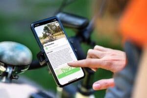 Bij elke route vind je een snelle downloadknop voor het GPX-bestand. Sla het bestand op op je telefoon of computer, en laad hem vervolgens in het juiste programma. Lees hiervoor de gebruiksaanwijzing van het apparaat of software.